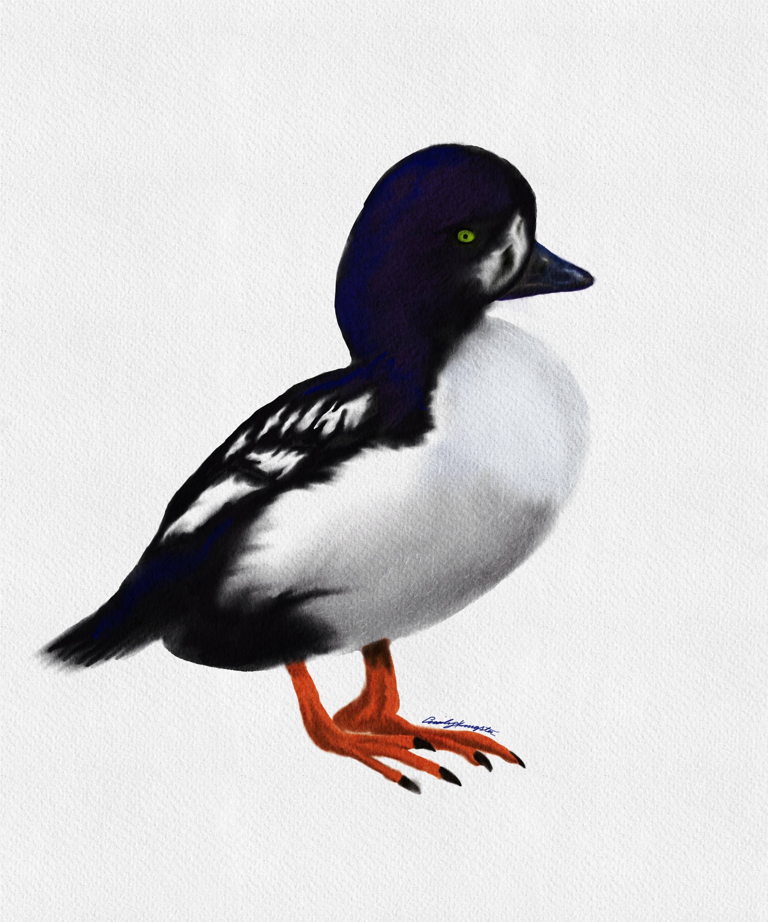 The rendition of the Barrow’s Goldeneye found in our logo was created by Emily Kingston using watercolor and pen.